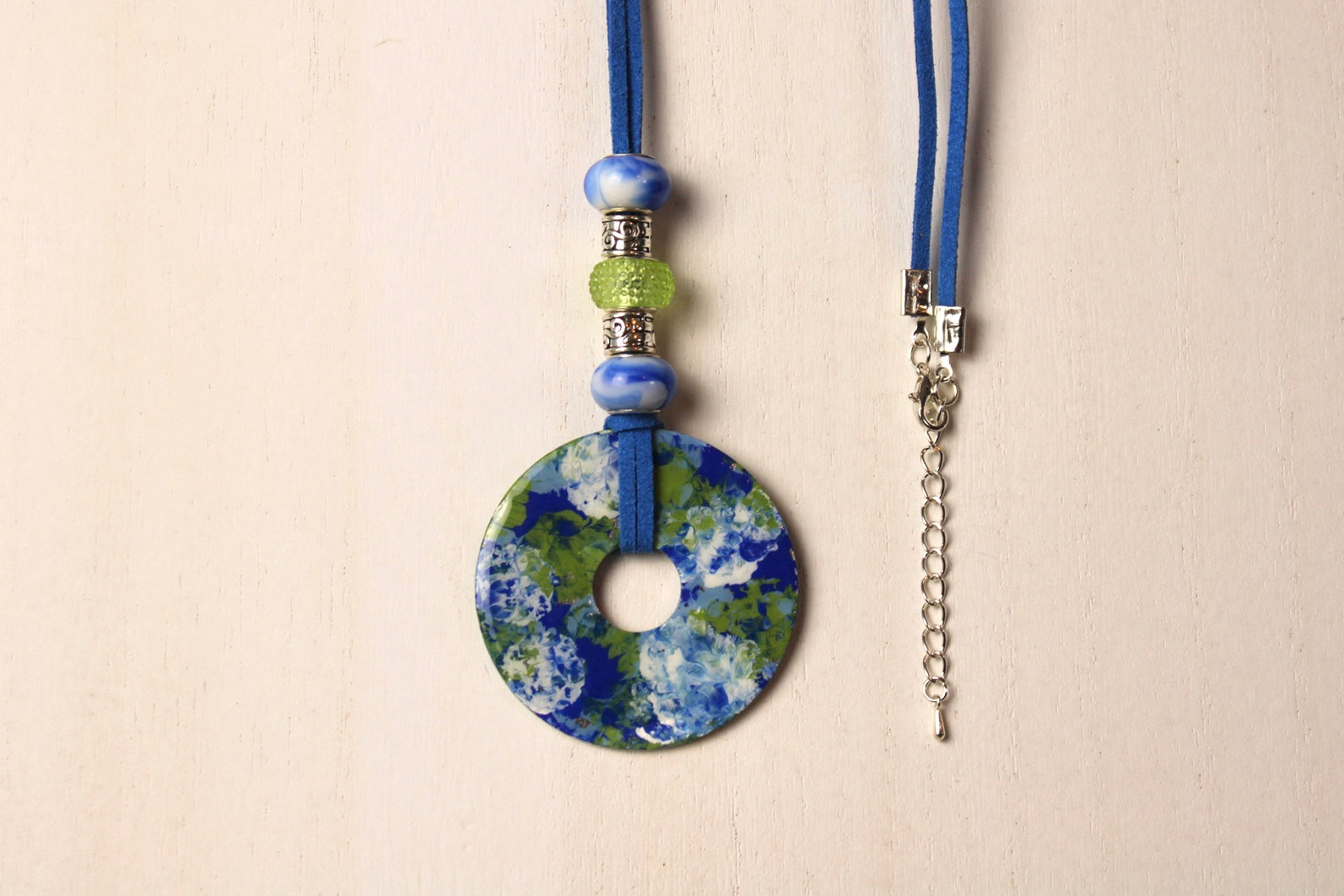 Artistically designed necklace with blue suede cord, color coordinating beads, and adjustable silver chain with clasp.