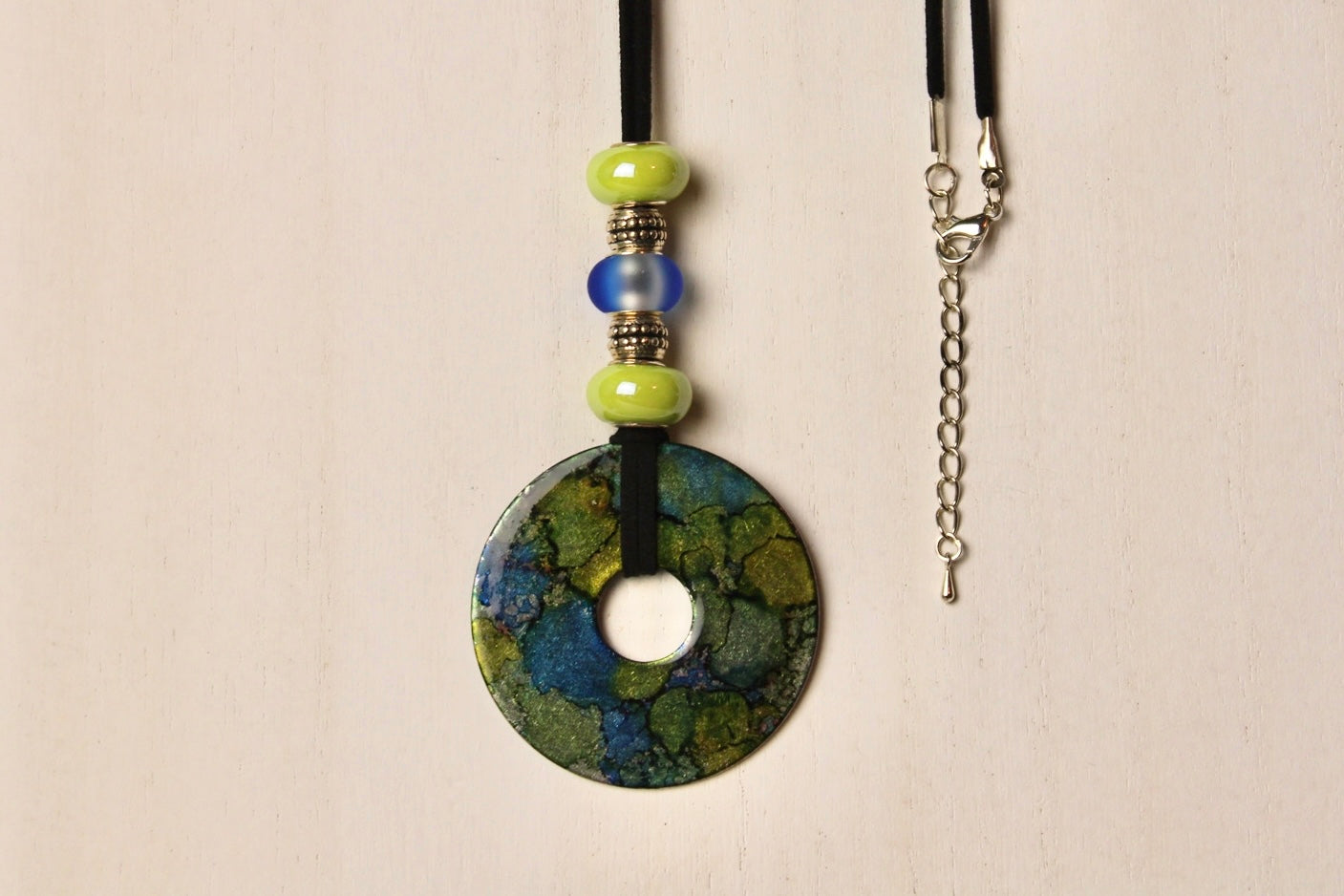 Artistically designed necklace with black suede cord, color coordinating beads, and adjustable silver chain with clasp.