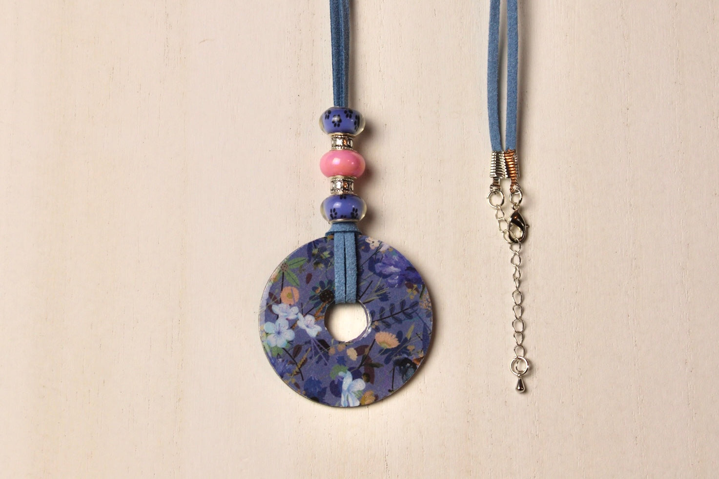 Artistically designed necklace with blue suede cord, color coordinating beads, and adjustable silver chain with clasp.