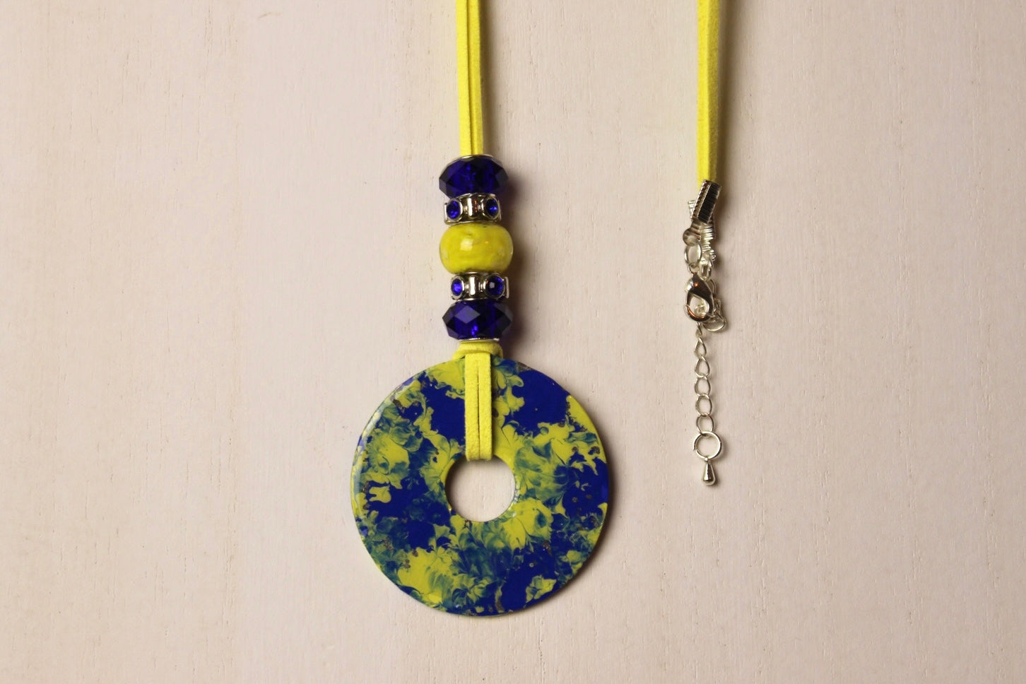 Artistically designed necklace with yellow suede cord, color coordinating beads, and adjustable silver chain with clasp.