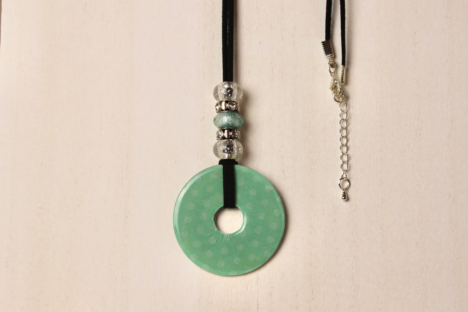 Artistically designed necklace with black suede cord, color coordinating beads, and adjustable silver chain with clasp.