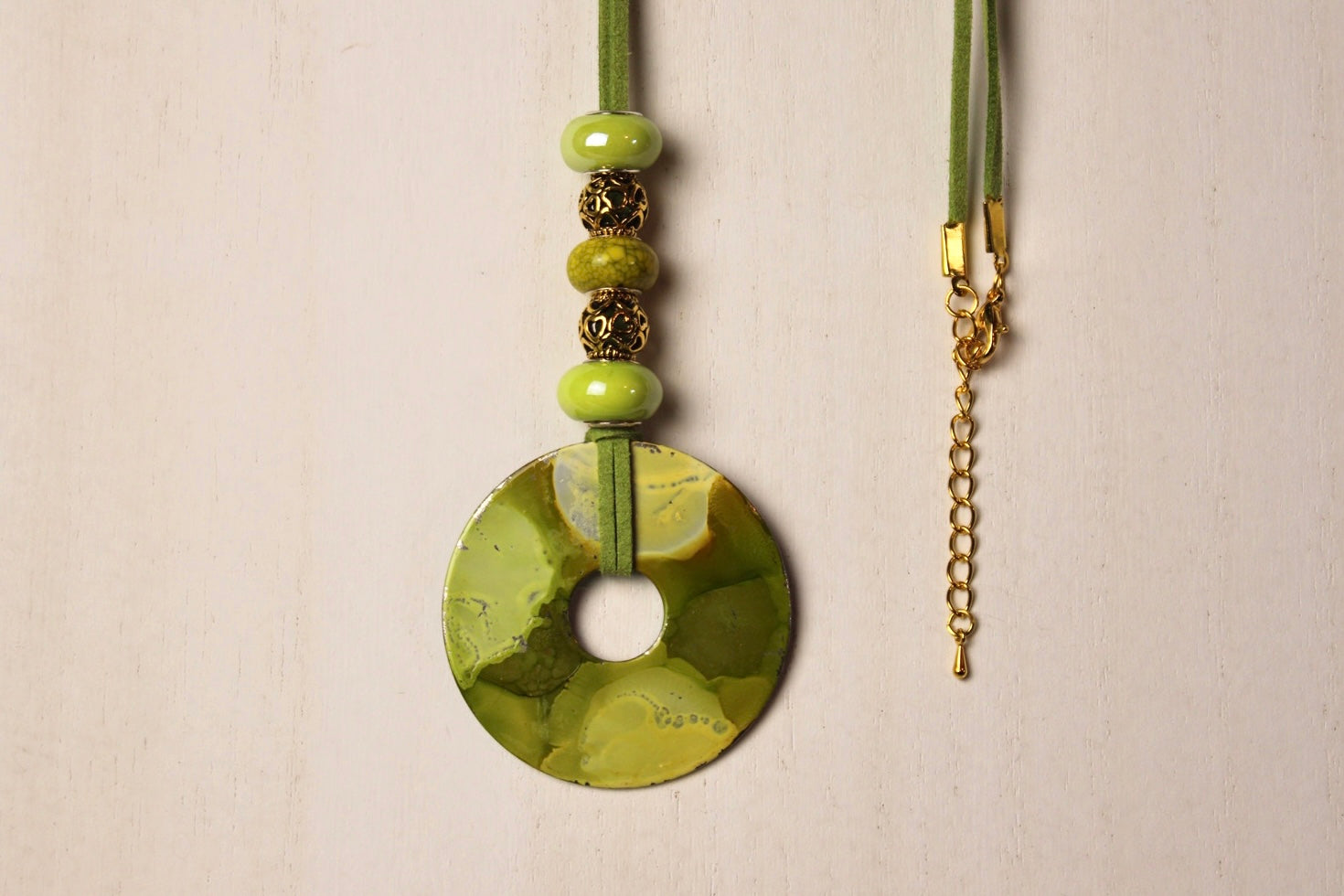 Artistically designed necklace with green suede cord, color coordinating beads, and adjustable gold chain with clasp.