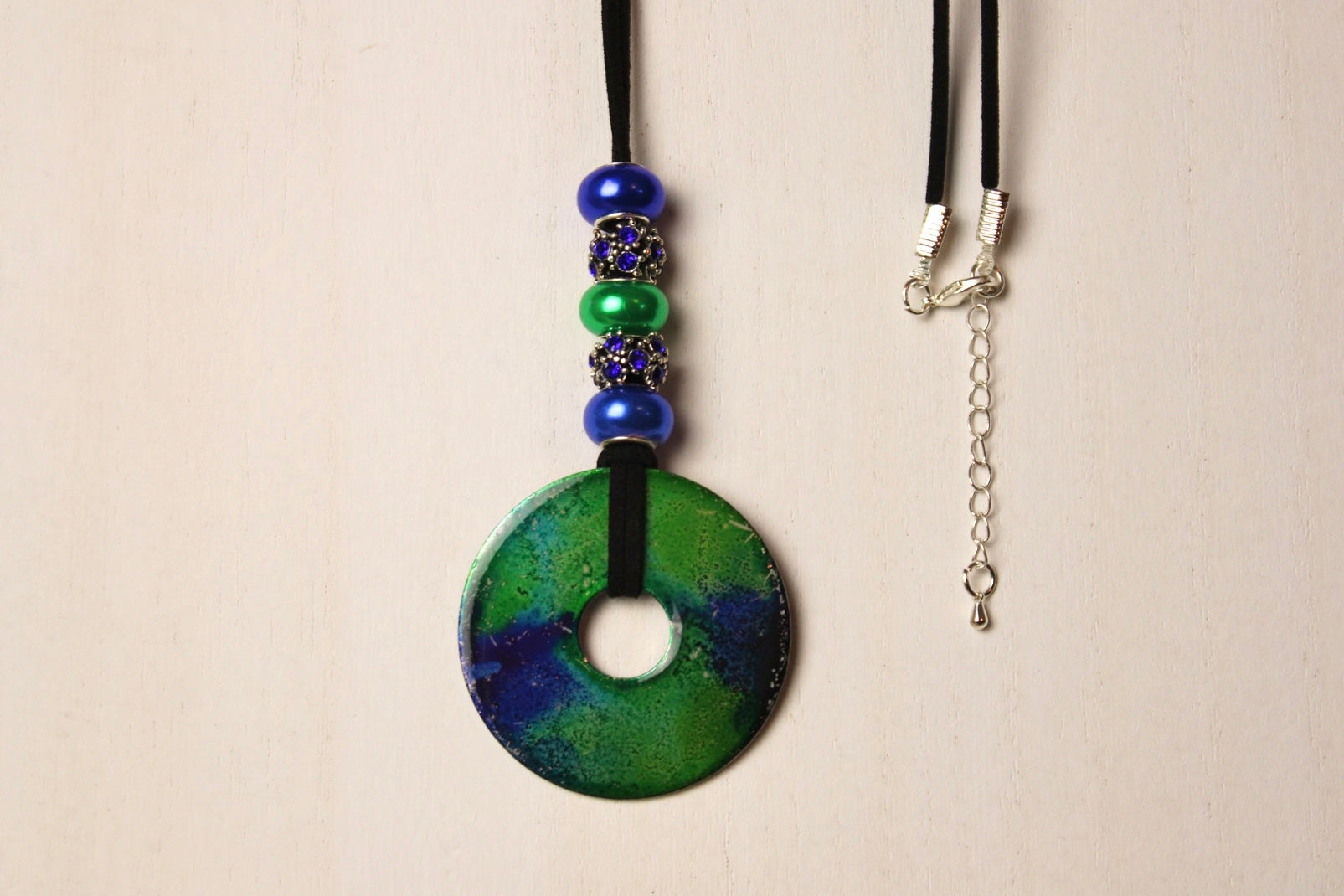 Artistically designed necklace with black suede cord, color coordinating beads, and adjustable silver chain with clasp.
