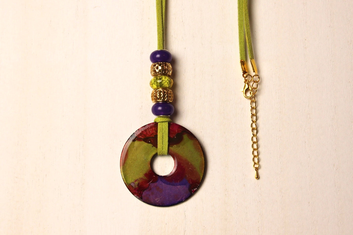 Artistically designed necklace with green suede cord, color coordinating beads, and adjustable gold chain with clasp.