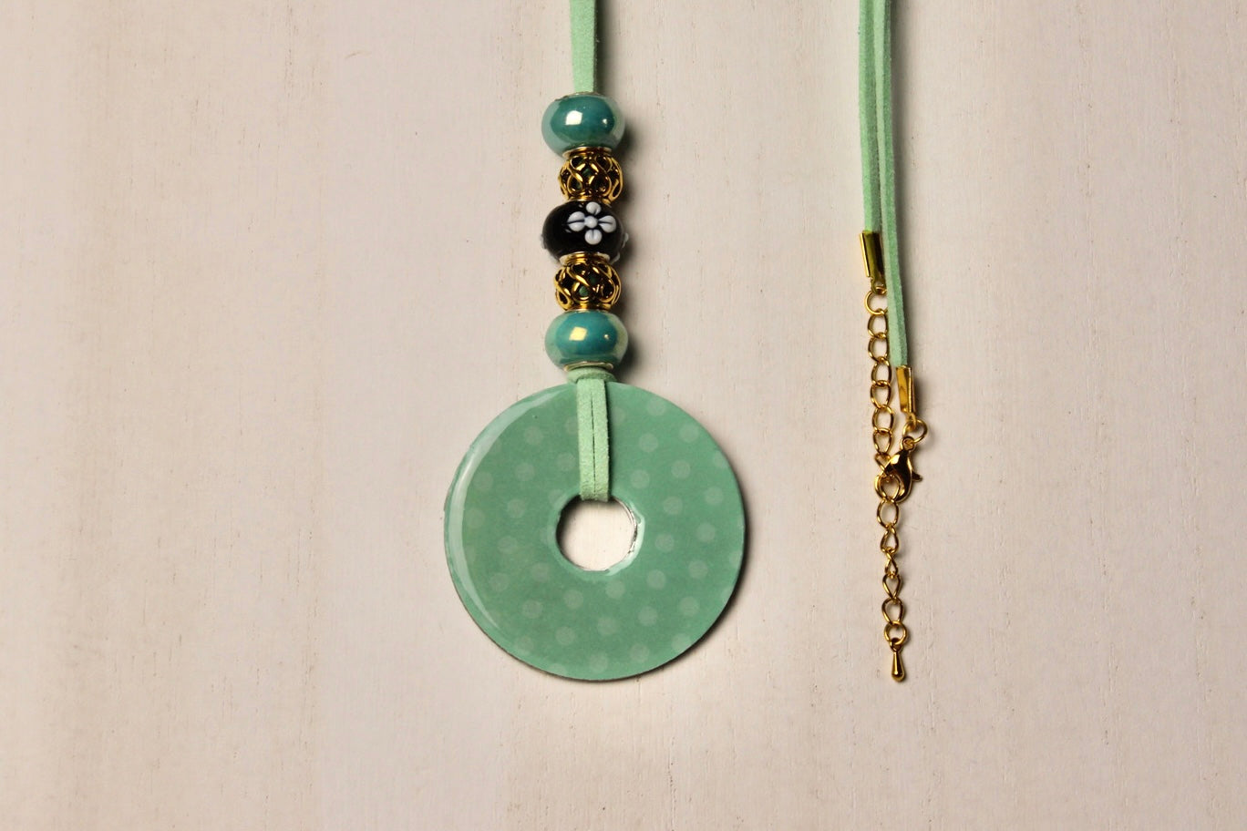 Artistically designed necklace with aqua suede cord, color coordinating beads, and adjustable gold chain with clasp.