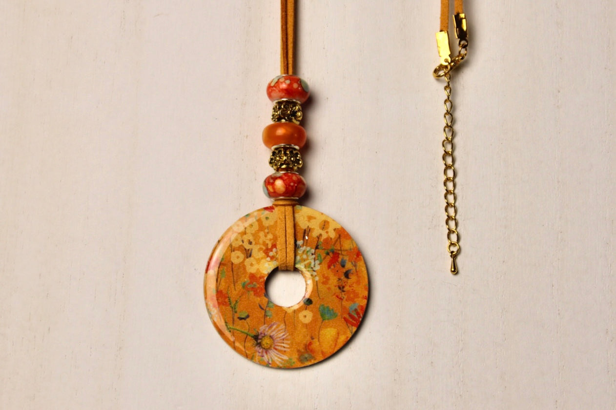 Artistically designed necklace with soft peachy orange suede cord, color coordinating beads, and adjustable gold chain with clasp.