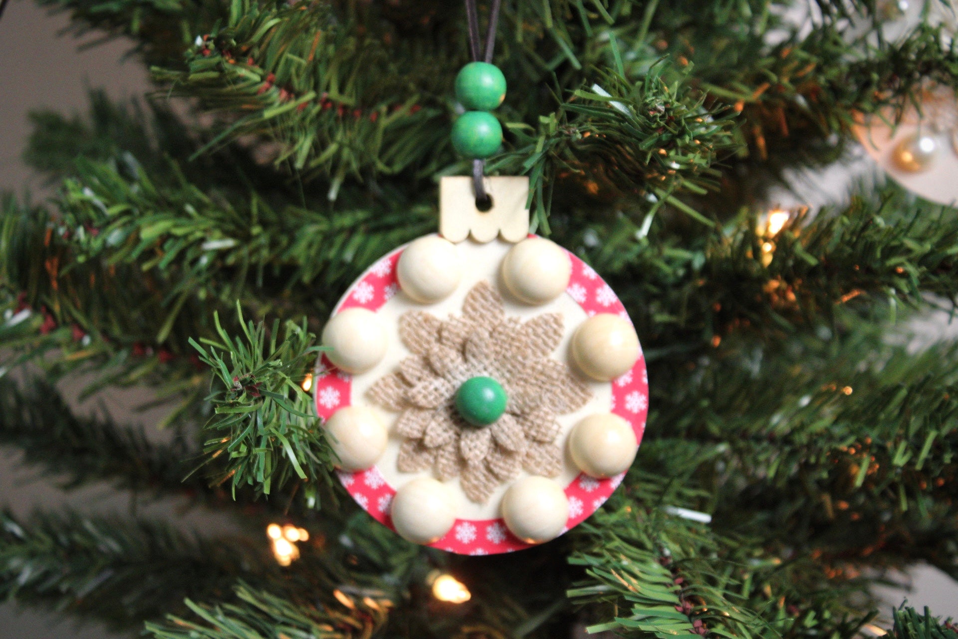Lightweight wood ornament with natural wood background, natural wood and green bead accents, tan flower applique, red trim, and a dark brown suede hanging cord. Width is 3.75 inches.