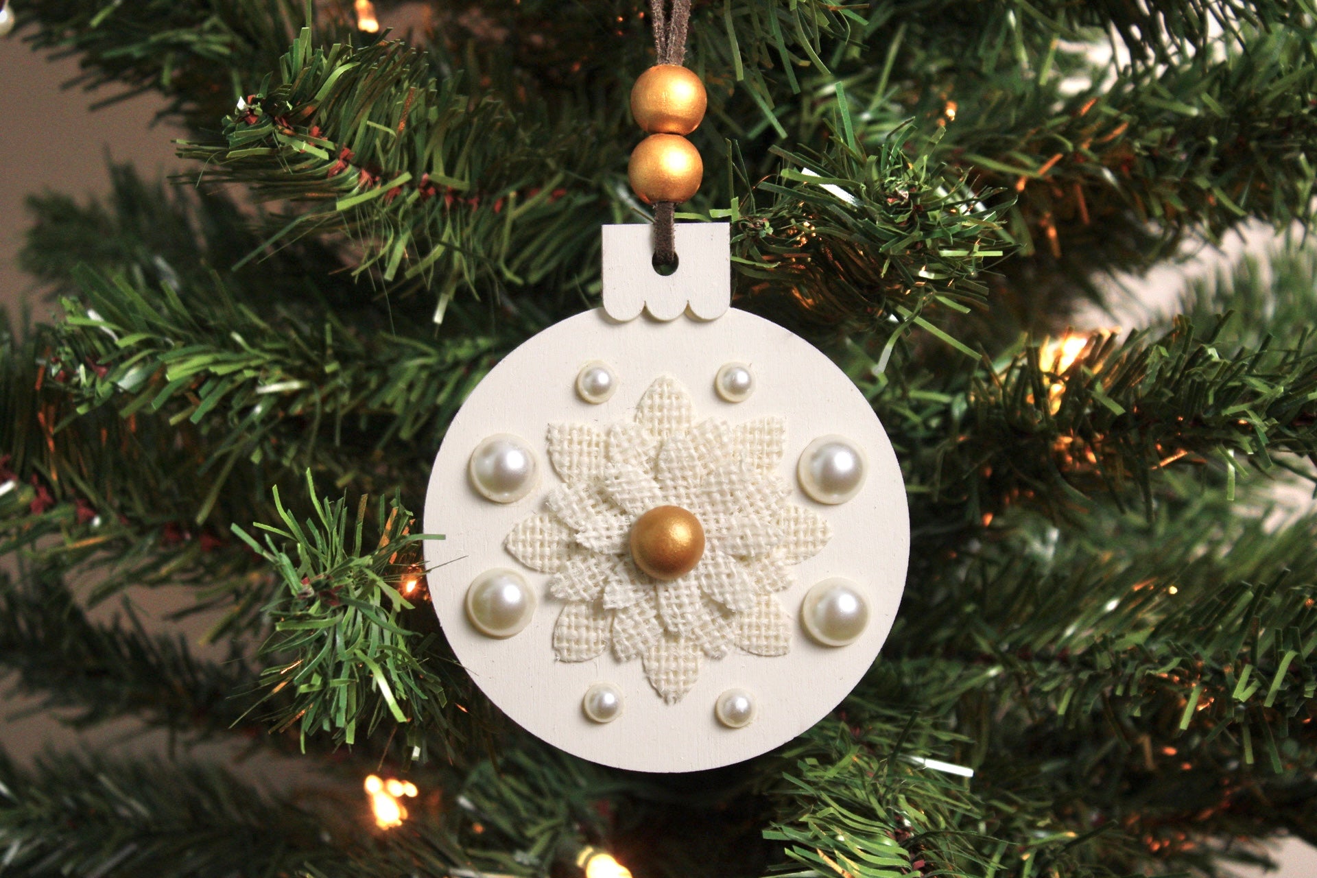 Lightweight wood ornament with ivory background, pearl and gold bead accents, ivory flower applique, and a dark brown suede hanging cord. Width is 3.75 inches.