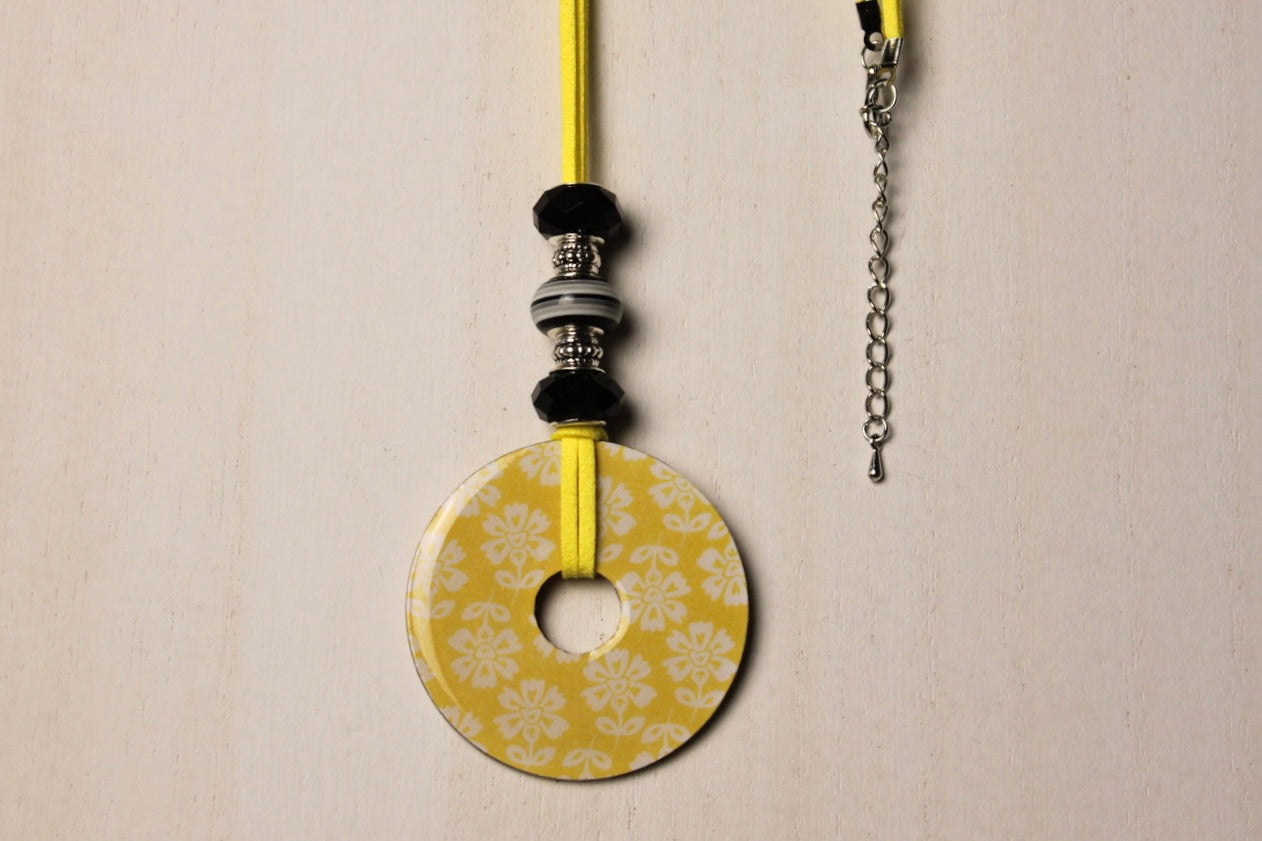 Artistically designed necklace with yellow suede cord, color coordinating beads, and adjustable silver chain with clasp.