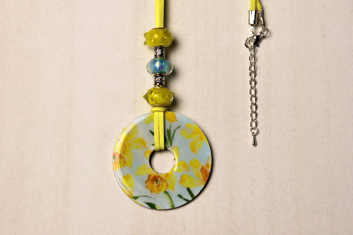 Artistically designed necklace with yellow suede cord, color coordinating beads, and adjustable silver chain with clasp.